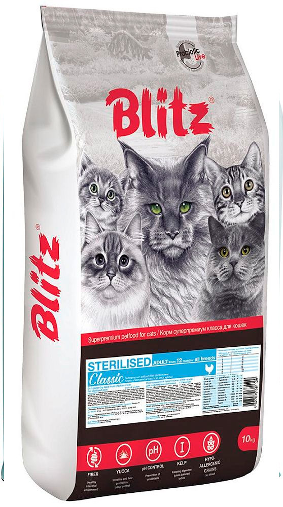 BLITZ Classic Sterilised Adult Cat (Курица) — это полнорационный сухой корм класса суперпремиум, разработанный с учётом потребностей стерилизованных кошек и кастрированных котов.