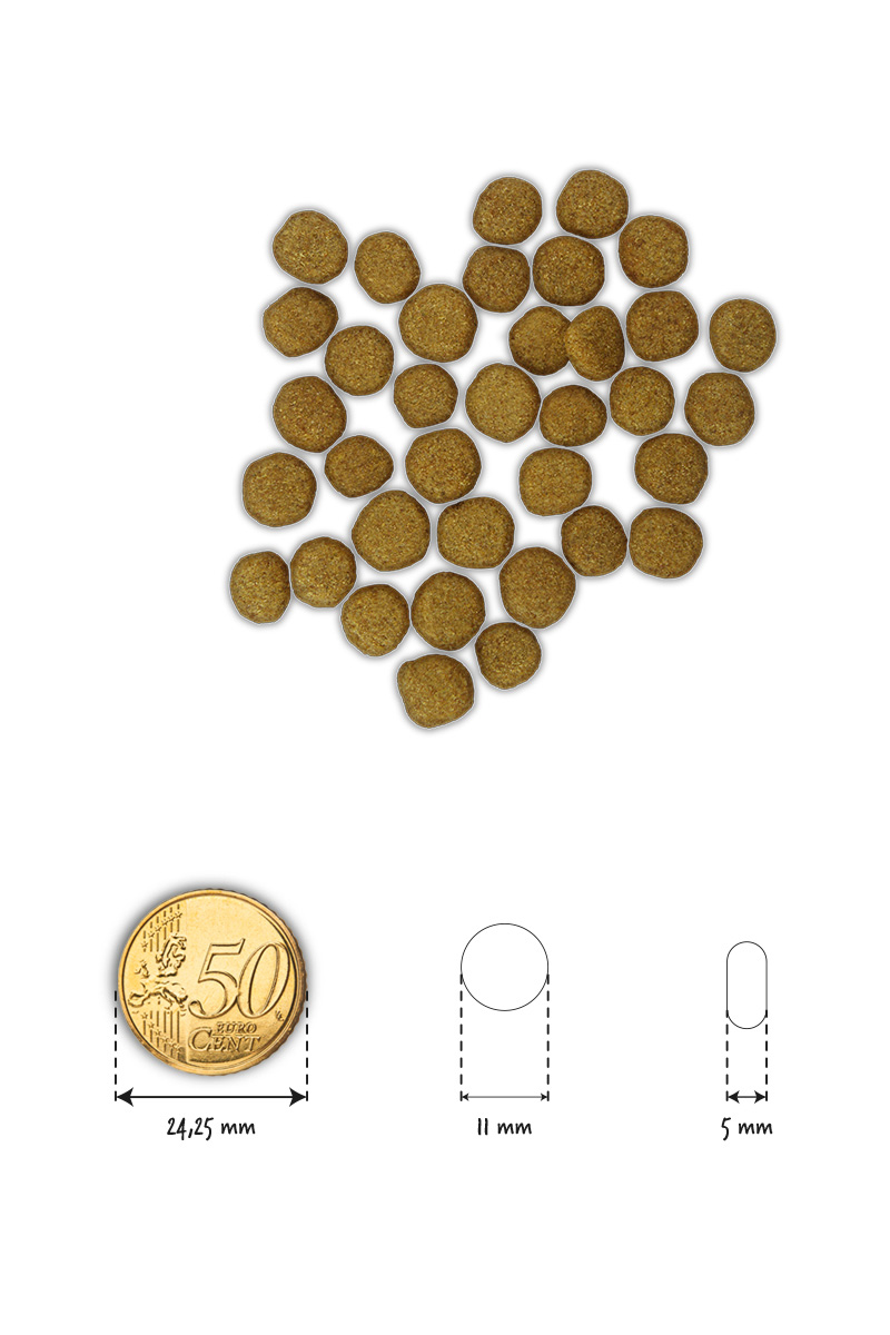 ДОБАВКИ: ПИЩЕВЫЕ ДОБАВКИ: Витамин А 19000 МЕ/кг, витамин D3 1600 МЕ/кг, витамин Е 600 мг/кг, витамин С 65 мг/кг, железо (моногидрат сульфата железа (II)) 75 мг/кг, йод (йодид калия) 3,5 мг/кг, медь (пентагидрат сульфата меди (II)) 10 мг/кг, марганец (моногидрат сульфата марганца) 7,5 мг/кг, цинк (оксид цинка) 120 мг/кг, селен (селенит натрия) 0,12 мг/кг, DL-метионин 500 мг/кг, таурин 1000 мг/кг, L-карнитин 240 мг/кг