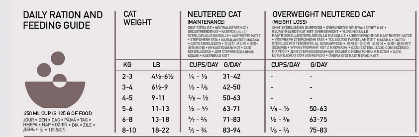 Белок 42%, жир 15%, сырая зола 10%, клетчатка 6%, влажность 10%, кальций 1,4%, фосфор 1,1%, магний 0,1%, таурин 0,2%, Омега-6 ЖК 2,4%, Омега-3 ЖК 1%, ДГК/ЭПК 0,3%/0,2%, L-карнитин 33мг/кг