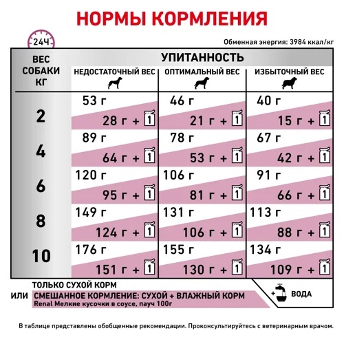 При этом корм содержит пониженное количество фосфора и умеренное количество высококачественного белка для поддержания функции почек.